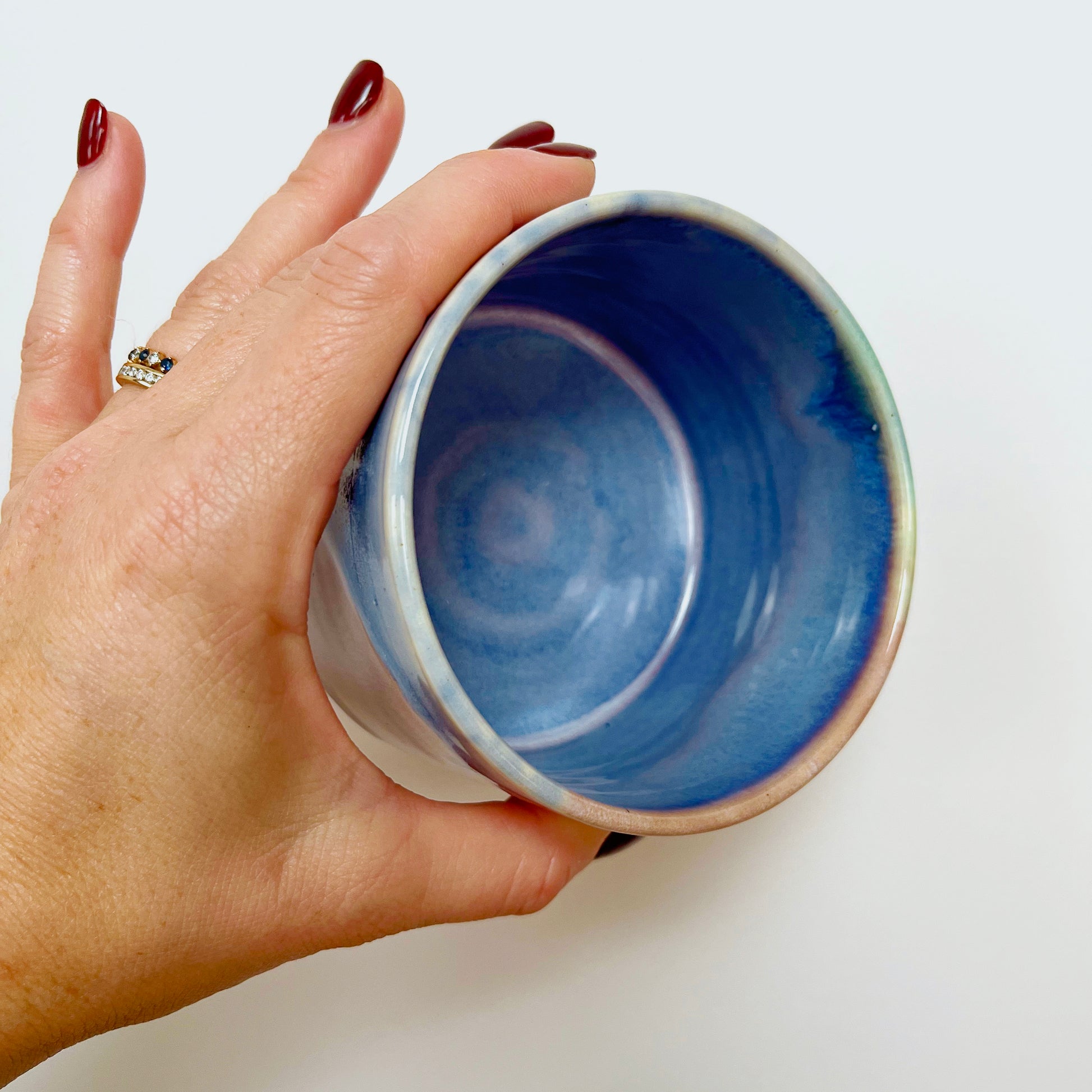This icecream bowl is hand thrown on a pottery wheel with white stoneware clay. It is glazed with a combination of drippy blues and purples. It is microwave and dishwasher safe.