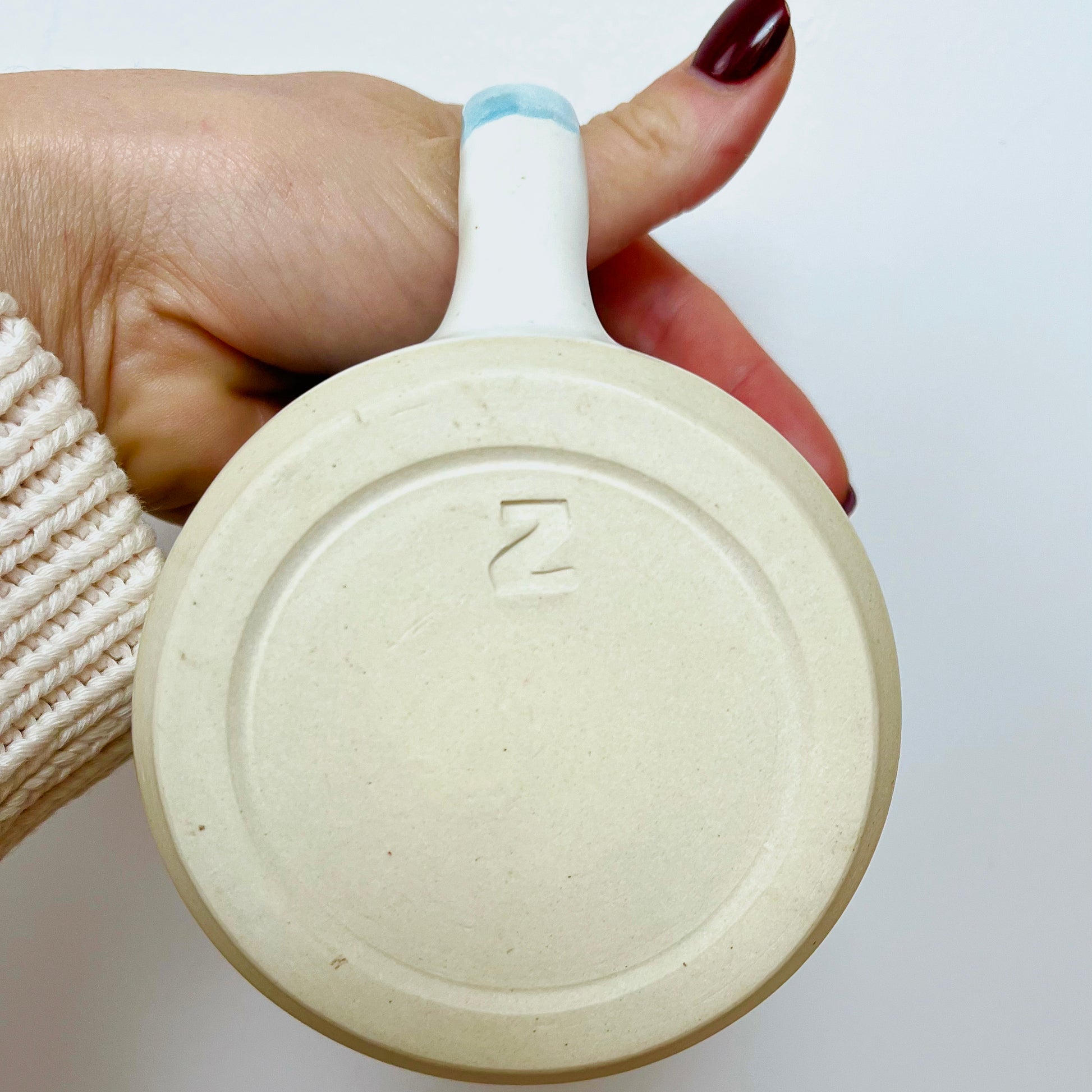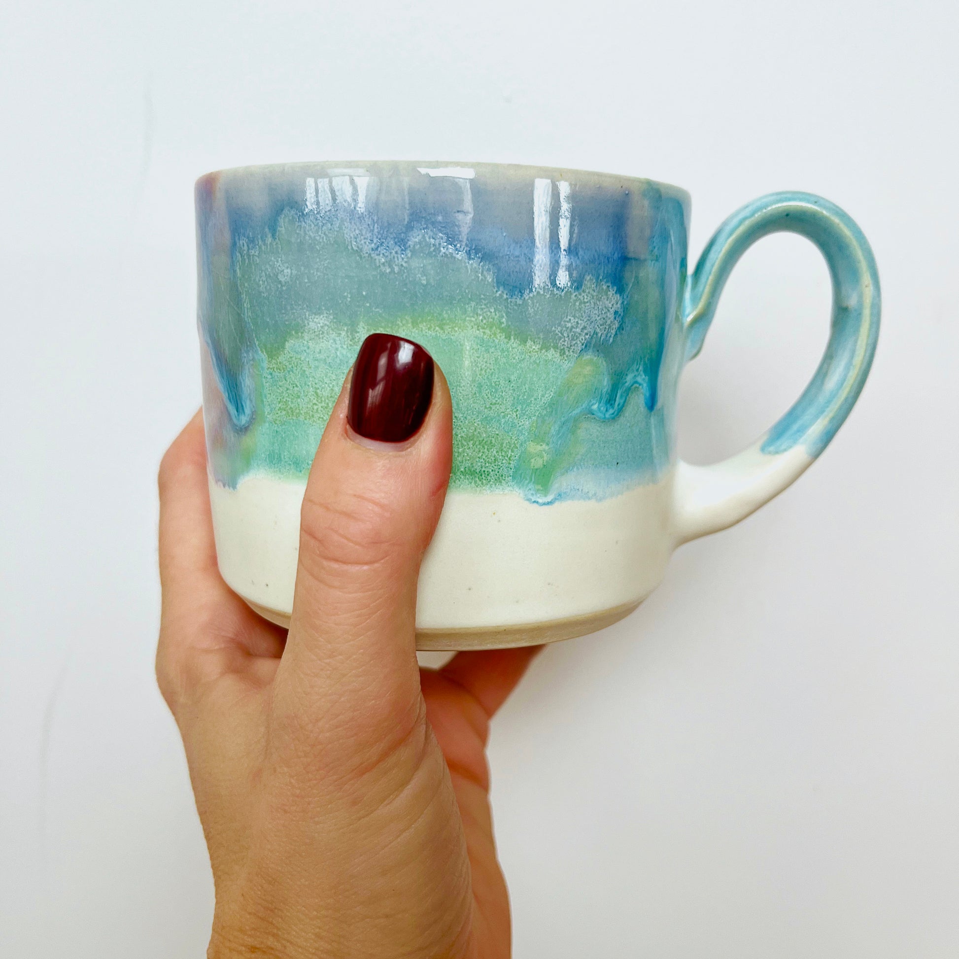 This mug is hand thrown on a pottery wheel with white stoneware clay. It is glazed with a combination of drippy blues and purples with a satin white on the bottom. It is microwave and dishwasher safe.