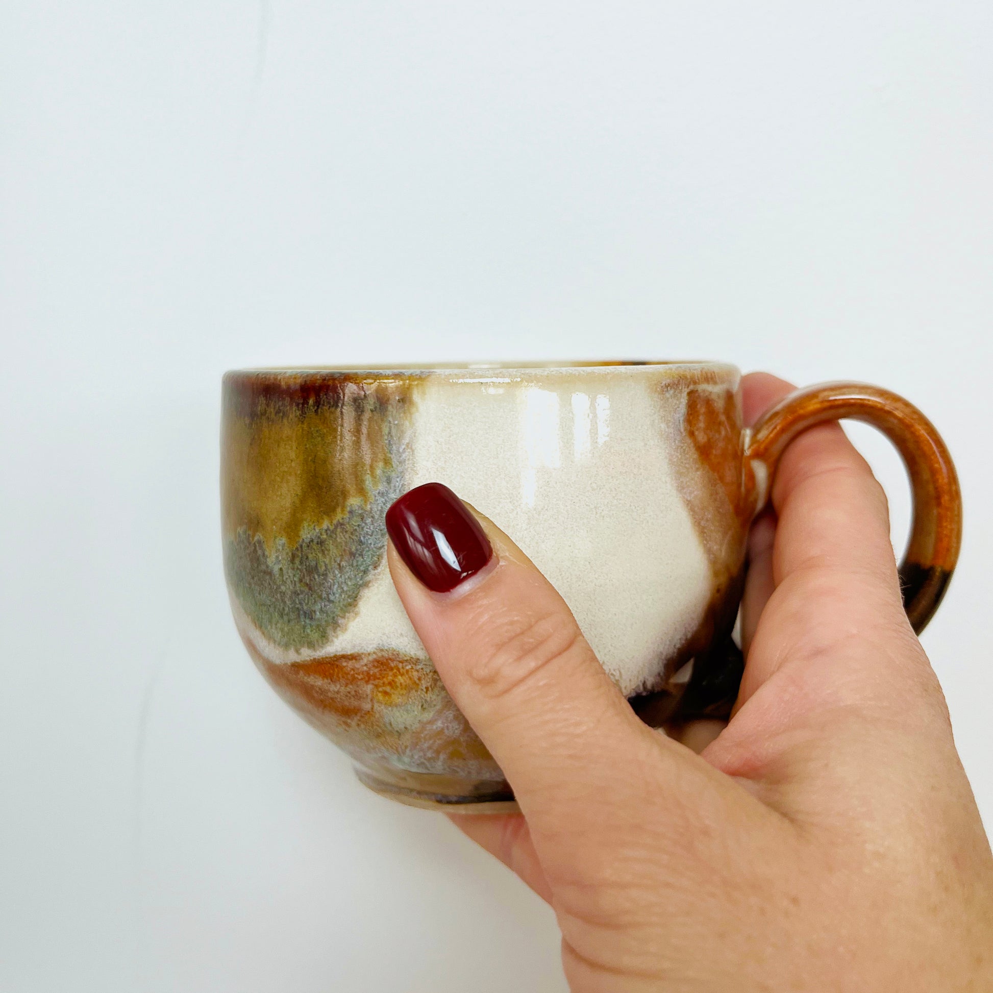 This mug is hand thrown on a pottery wheel with white stoneware clay. It is glazed in a combination of browns whites. It is microwave and dishwasher safe.