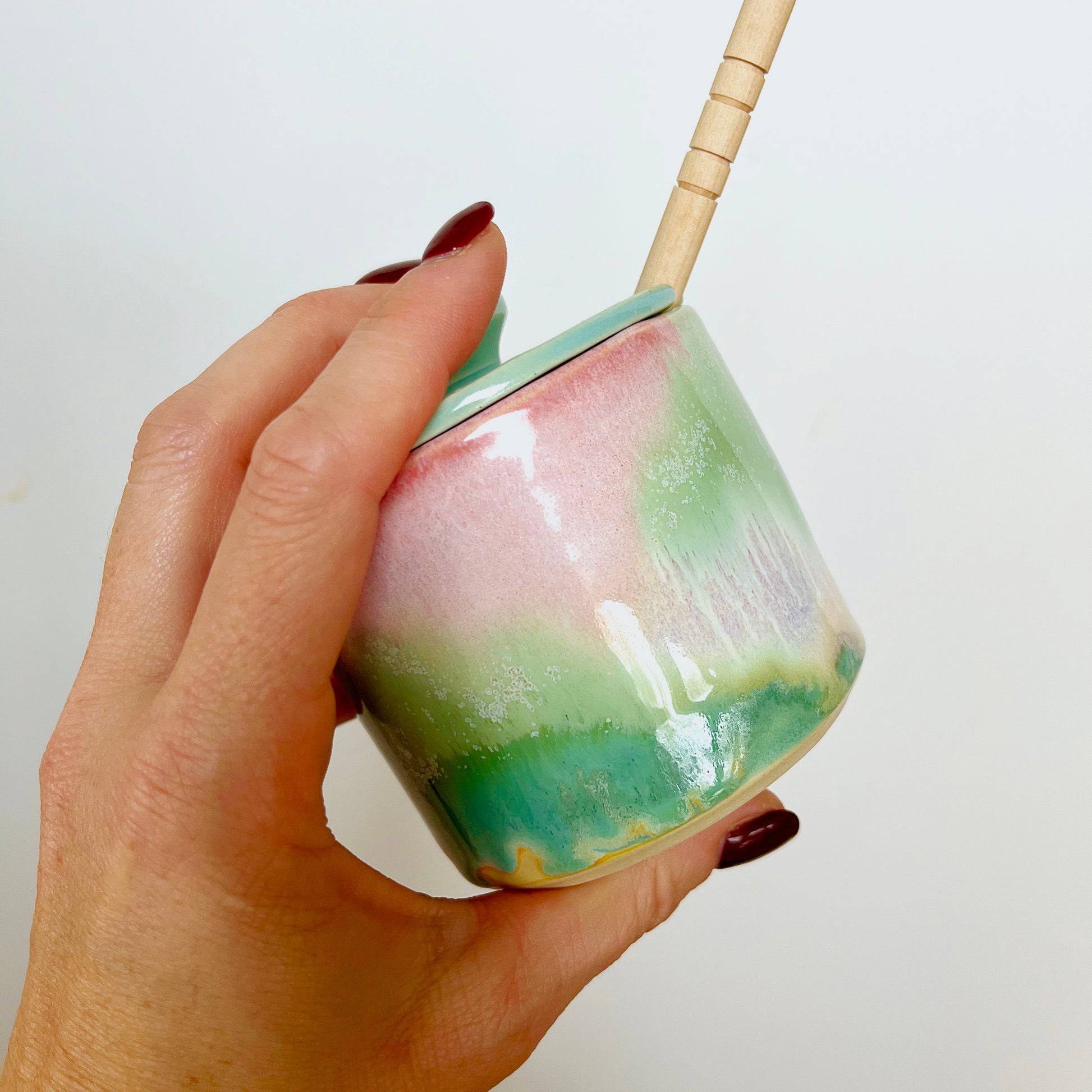 This honey jar is hand thrown on a pottery wheel with white stoneware clay. It is glazed with a combination of drippy greens, pinks, yellows, and orange. It is microwave and dishwasher safe.