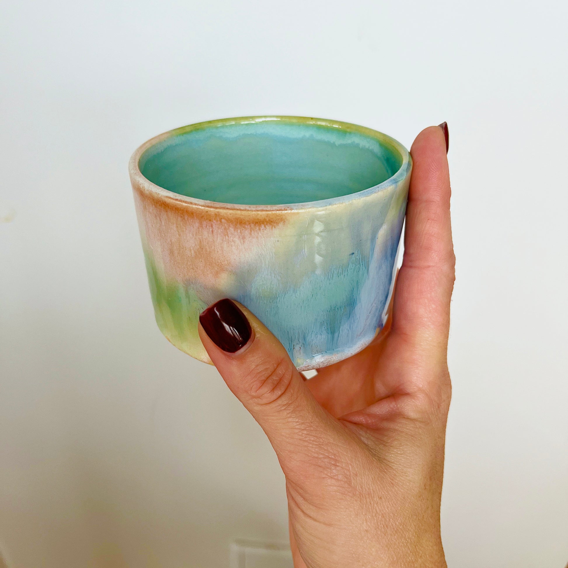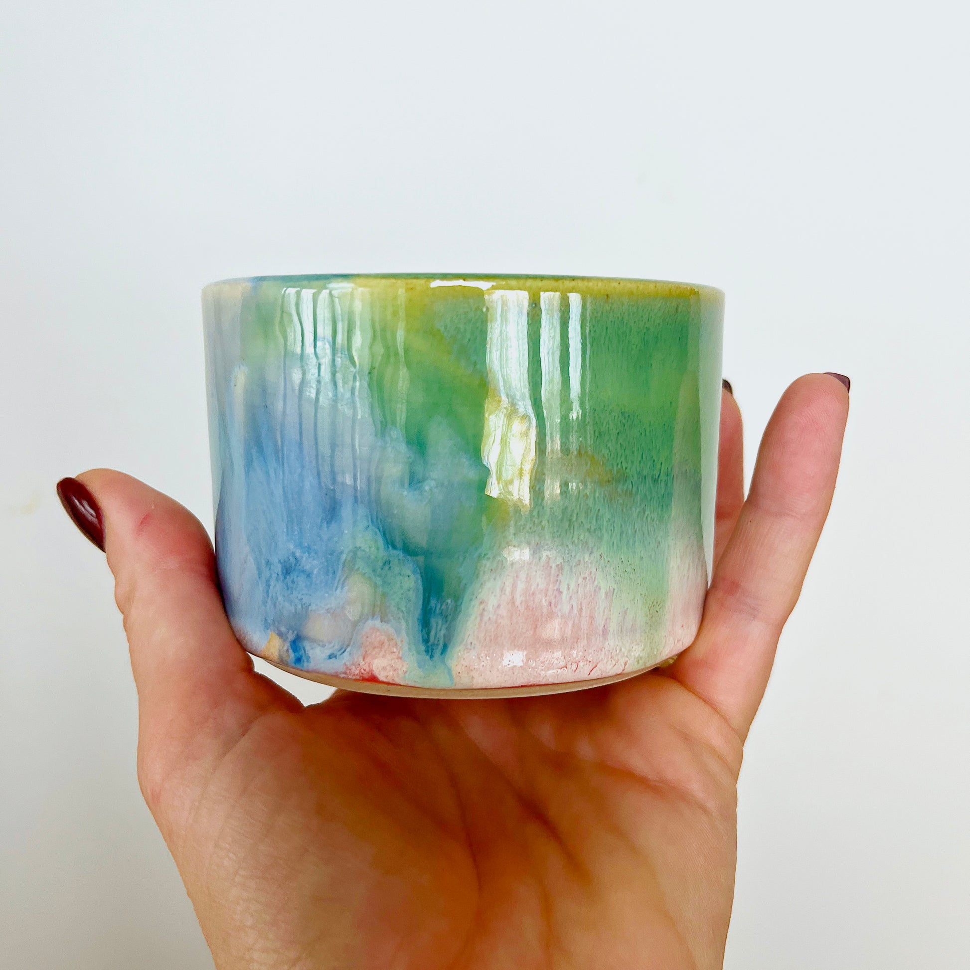 This icecream bowl is hand thrown on a pottery wheel with white stoneware clay. It is glazed with a combination of greens, purples, pinks and yellows. It is microwave and dishwasher safe.